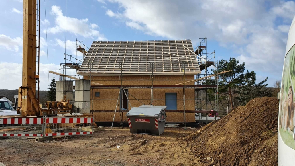 - Juli 2022: Das Haus wurde mittlerweile montiert und das Dach ist auch gedeckt und bereits regendicht. In den nächsten Wochen geht es mit dem Innenausbau, der Dämmung und dem Außenputz weiter. Wir halten Sie auf dem Laufenden.